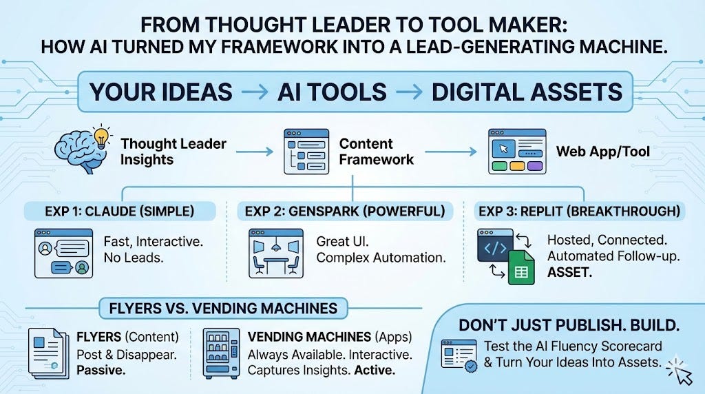From Thought Leader to Tool Maker in 3 ExperimentsHow AI Turned My Framework Into a Lead-Generating MachineARVLDec 09, 2025∙ Paid22ShareMost entrepreneurs turn their insights into content. Blog posts. PDFs. Social media threads.But what if you could turn them into apps instead?AI Workflows for Wealth by Arvell Craig is a reader-suppo…SubscribeContinue reading this post for free, courtesy of ARVL.Claim my free postOr purchase a paid subscription.PreviousNext